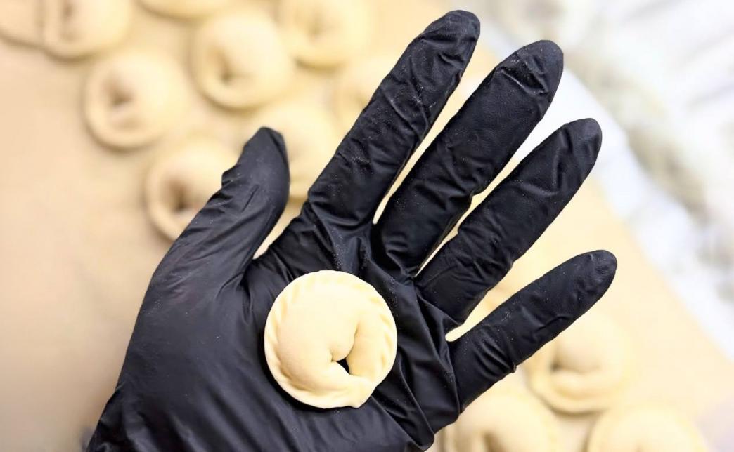 - пельмени с курицей и свининой, 1 кг: мука пшеничная, вода, масло растительное, яйца, соль, домашний фарш (свинина, курица), лук репчатый, специи