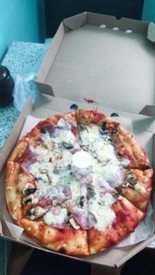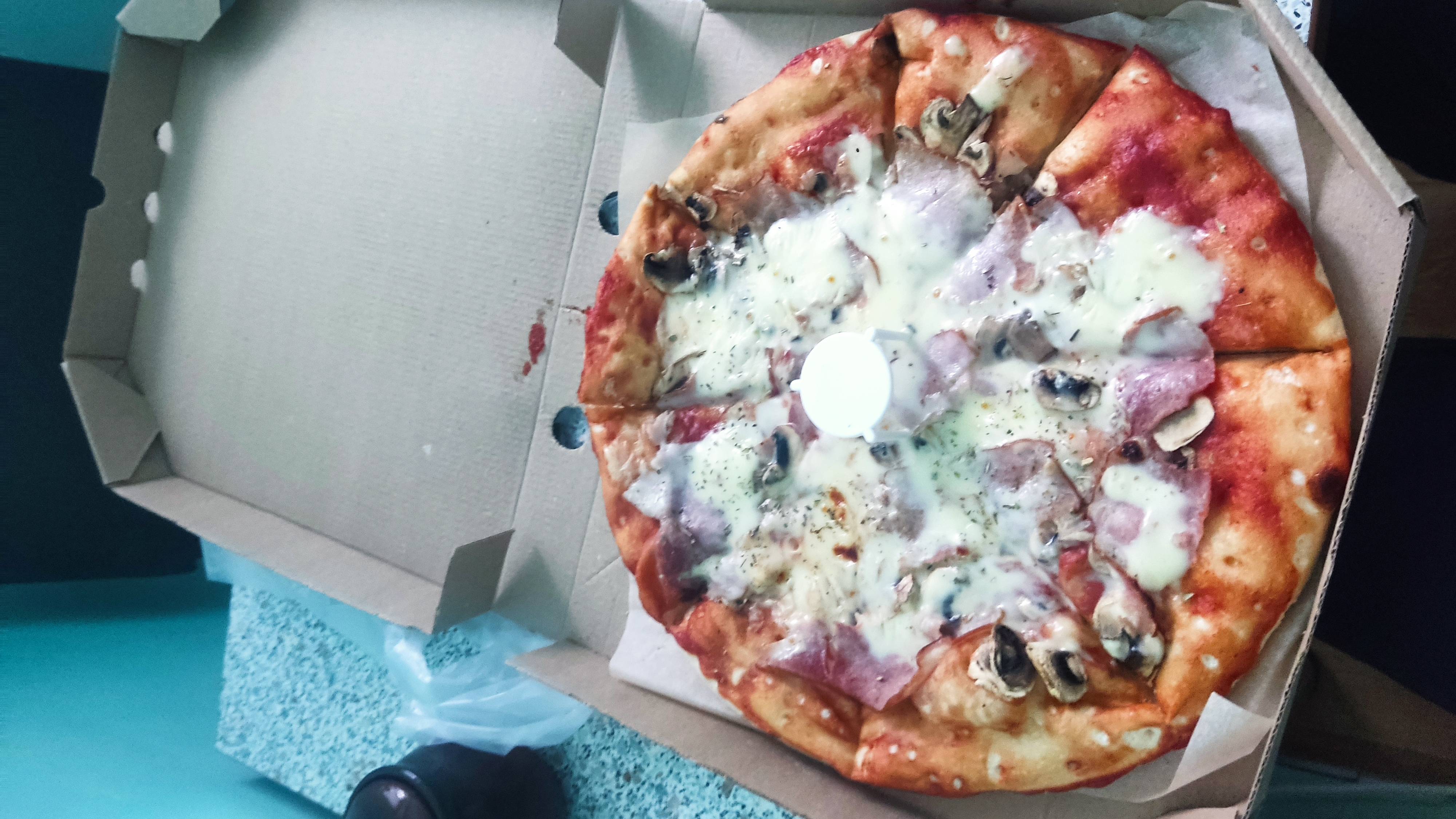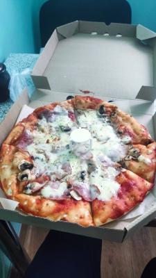 Зпказывала прошуто фунги, начинки совсем немного, сыр положили на несколько кусочков.Обильно смазали томатной пастой тесто ,которого очень много и немного начинки пицца готова