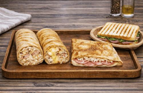 Состав: блинчики тонкие, ветчина варено-копченая, сыр твердые, сметана