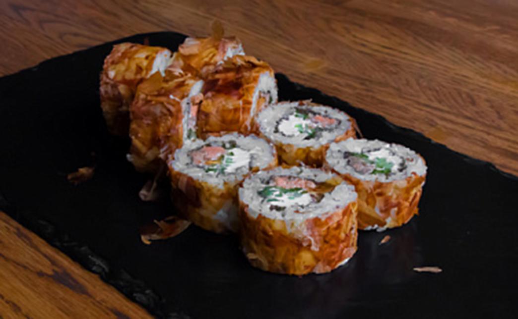 - запеченный ролл с тунцом: тунец, рис, нори, сырная шапка, соус терияки - 8 шт.